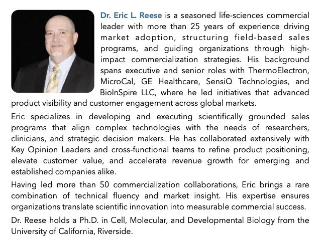 Meet Dr. Eric L. Reese, PhD, a true superhero of life sciences sales, specializing in field-executed sales programs that hit the bullseye, your customers. Teaming up with Key Thought Leaders (picture the Avengers of science), he helps companies, from scrappy startups to global titans, perfect their pitch and close deals like pros. With over 25 years in the game, Dr. Reese has racked up executive roles at ThermoElectron, MicroCal, GE Healthcare, SensiQ Technologies, and BioInSpire LLC. If a life science product is on the market, chances are he’s had a hand in selling it and selling it well.